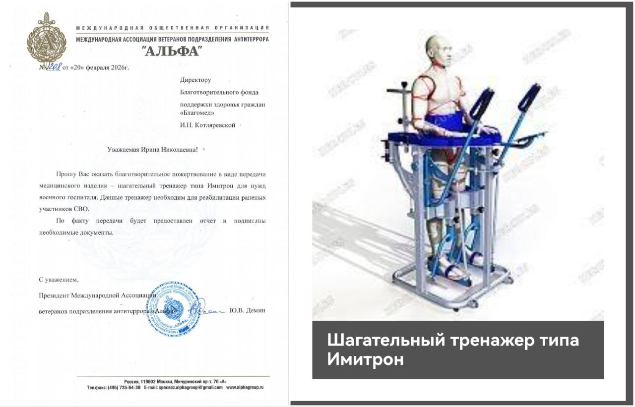 Обратилась за помощью Международная ассоциация ветеранов подразделения антитеррора "Альфа" для приобретения Реабилитационного оборудования - Шагательный тренажер типа Имитрон, который предназначен для выполнения комплексных реабилитационных упражнений в вертикальной позиции.